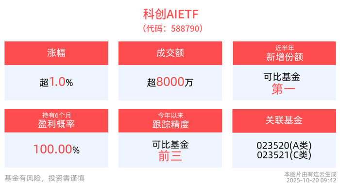 截至2025年10月20日09:42,上证科创板人工智能指数强势上涨1.22%,成分股优刻得上涨6.09%,奇安信上涨3.00%,道通科技上涨2.91%,合合信息,复旦微电等个股跟涨。科创AIETF(588790)上涨1.03%,最新价报0.78元。拉长时间看,截至2025年10月17日,科创AIETF近3月累计上涨30.52%。