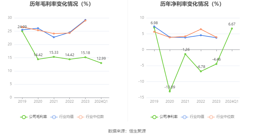 2024年第一季度,公司毛利率为12.99%,同比上升0.63个百分点;净利率为6.67%,较上年同期上升17.25个百分点。