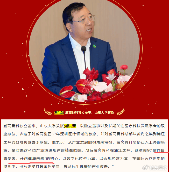 山东大学教授刘洪渭的寄语,说出来大家对威高骨科的期待:“期待威高骨科在浦江之畔,继续秉承‘偕同白衣使者,开创健康未来’的初心,在国际医疗创新的浪潮中,书写更多打破国外垄断、惠及民生健康的产业传奇。”