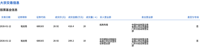 1月12日,埃夫特大宗交易成交30万股,成交额627.6万元,占当日总成交额的1.64%,成交价20.92元,较市场收盘价23.82元折价12.17%。