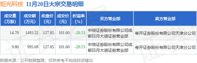 11月20日炬光科技现2笔折价20.53%的大宗交易 合计成交2489.2万元