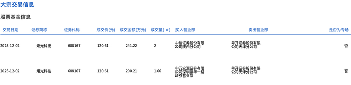 12月2日,炬光科技大宗交易成交3.66万股,成交额441.43万元,占当日总成交额的0.79%,成交价120.61元,较市场收盘价134.1元折价10.06%。