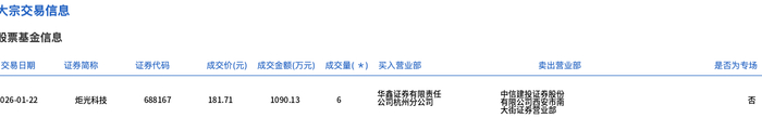 1月22日,炬光科技大宗交易成交6万股,成交额1090.13万元,占当日总成交额的1.17%,成交价181.71元,较市场收盘价194.83元折价6.73%。