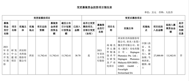 原本的“研发中心建设项目”计划建设成为公司新技术的储备基地、量产测试基地,以及引进技术的消化吸收和创新基地。原项目主要是针对公司研发中心的建设,不直接产生经济效益。原项目实施主体为西安炬光科技股份有限公司,拟投入资金1.174261亿元,目前已投入金额38.7万元。