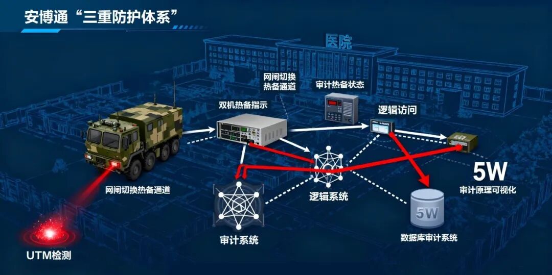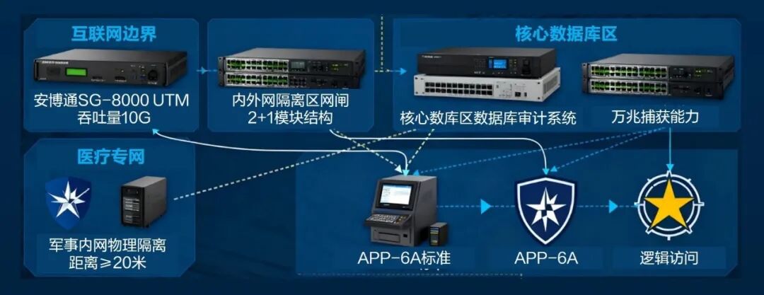 针对军队医疗的特殊需求,安博通以“UTM+网闸+数据库审计”的协同模式,构建覆盖“外部防御-数据传输-操作溯源”的全链路屏障,精准契合医疗业务特性与军队网安标准。