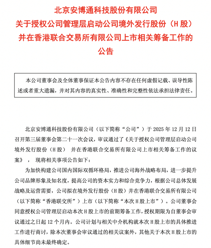 瑞财经 吴文婷12月14日,安博通发布公告称,公司于2025年12月12日召开第三届董事会第二十一次会议,审议通过了《关于授权公司管理层启动公司境外发行股份(H股)并在香港联合交易所有限公司上市相关筹备工作的议案》。