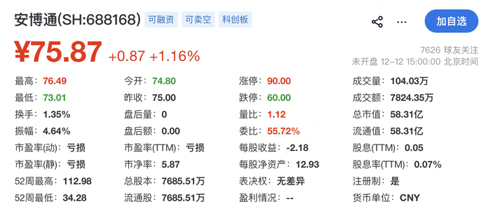 截至发稿时,安博通A股报75.87元,涨1.16%,总市值约58.31亿元。