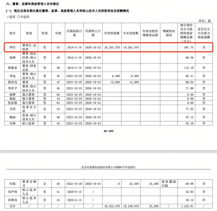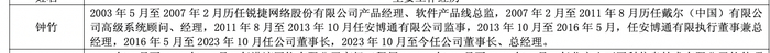 资料显示,钟竹,现年45岁,2003年5月至2007年2月历任锐捷网络股份有限公司产品经理、软件产品线总监,2007年2月至2011年8月历任戴尔(中国)有限公司高级系统顾问、经理,2011年8月至2013年10月任安博通有限公司监事,2013年10月至2016年5月,任安博通有限执行董事兼总经理,2016年5月至2023年10月任公司董事长,2023年10月至今任公司董事长、总经理。