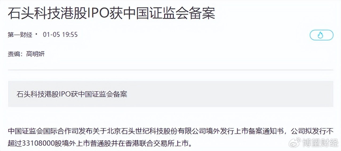 据《第一财经》等多家媒体报道,2026年1月5日,石头科技已收到中国证监会出具的《境外发行上市备案通知书》,正式启动港股IPO征程。值得一提的是,这份备案通知书的落款日期是2025年12月24日,意味着石头科技已经获得境内监管的关键通行证。