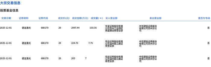 12月1日,德龙激光大宗交易成交118.11万股,成交额3425.19万元,占当日总成交额的26.26%,成交价29元,较市场收盘价33.21元折价12.68%。