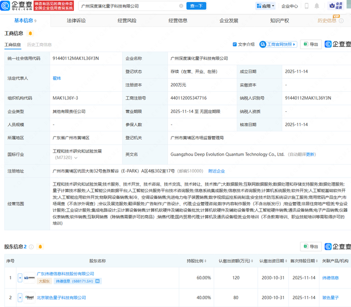 企查查APP显示,近日,广州深度演化量子科技有限公司成立,法定代表人为翟炜,经营范围包含:大数据服务;互联网数据服务;人工智能公共数据平台;人工智能公共服务平台;人工智能基础软件开发等。企查查股权穿透显示,该公司由纬德信息(688171)、北京玻色量子科技有限公司共同持股。