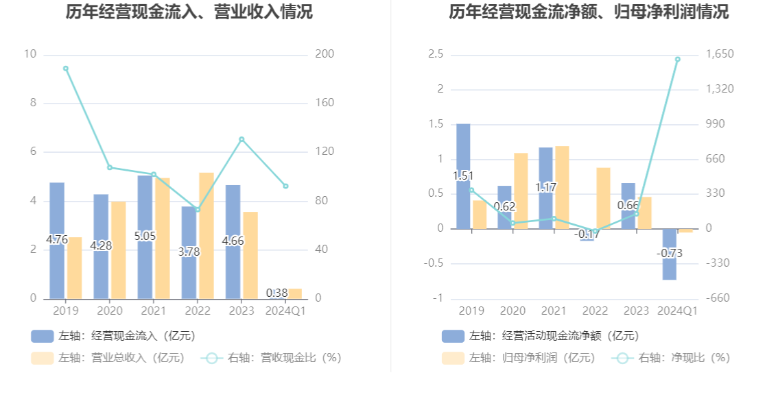 截至2024年一季度末,公司经营活动现金流净额为-7290.93万元,同比减少4233.68万元;筹资活动现金流净额同比增加2.12万元;投资活动现金流净额6.24亿元,上年同期为4.08亿元。