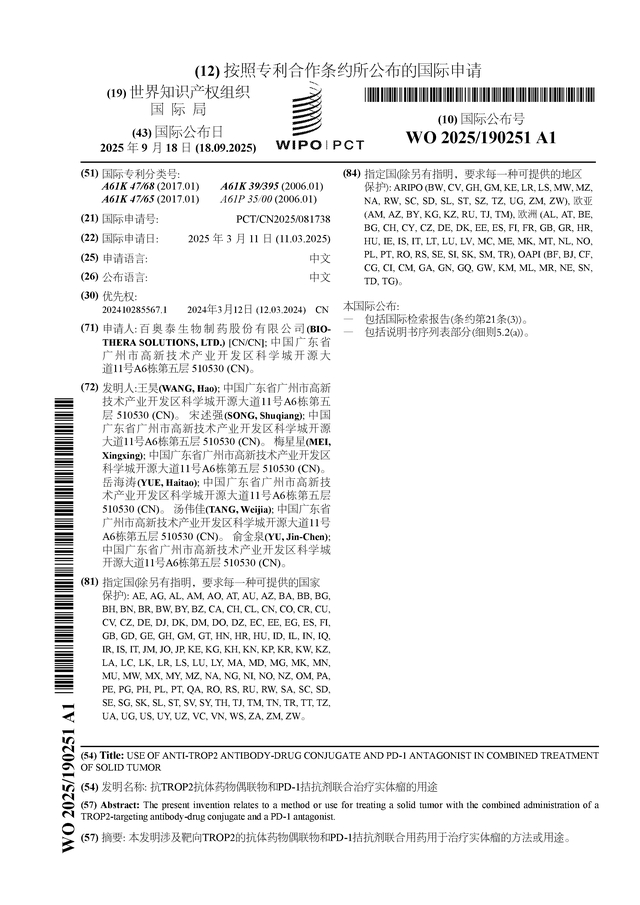 百奥泰公布国际专利申请:“抗TROP2抗体药物偶联物和PD-1拮抗剂联合治疗实体瘤的用途”