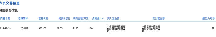 11月14日,万德斯大宗交易成交100万股,成交额2135万元,占当日总成交额的54.34%,成交价21.35元,较市场收盘价26.27元折价18.73%。