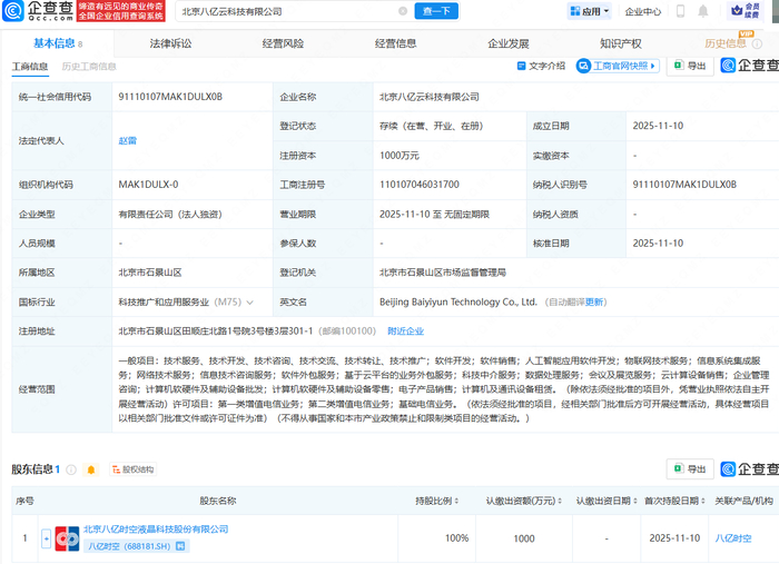企查查APP显示,近日,北京八亿云科技有限公司成立,法定代表人为赵雷,注册资本为1000万元,经营范围包含:人工智能应用软件开发;物联网技术服务;数据处理服务;会议及展览服务;云计算设备销售等。企查查股权穿透显示,该公司由八亿时空(688181)全资持股。