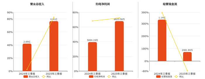 公司营业总收入为4.91亿元。归母净利润为8623.56万元。经营活动现金净流入为2481.84万元,较去年同报告期经营活动现金净流入减少8888.92万元,同比较去年同期下降78.17%。