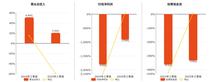 公司营业总收入为3.56亿元,在已披露的同业公司中排名第100,较去年同报告期营业总收入减少4.22亿元,同比较去年同期下降54.25%。归母净利润为-2.04亿元,在已披露的同业公司中排名第98。经营活动现金净流入为-3.96亿元,在已披露的同业公司中排名第96。