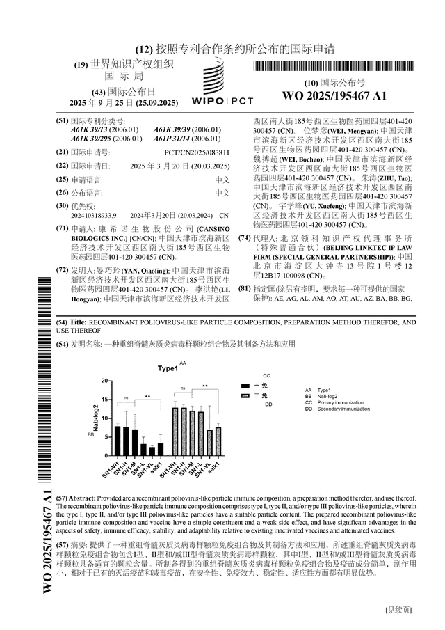 康希诺公布国际专利申请:“一种重组脊髓灰质炎病毒样颗粒组合物及其制备方法和应用”