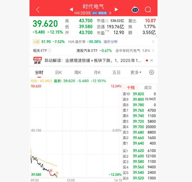 上证报中国证券网讯(记者 李五强)10月31日,时代电气H股开盘后一路下跌,截至11:09,时代电气报39.62港元/股,下跌12.15%。时代电气A股也一路下跌,跌幅超过7%。