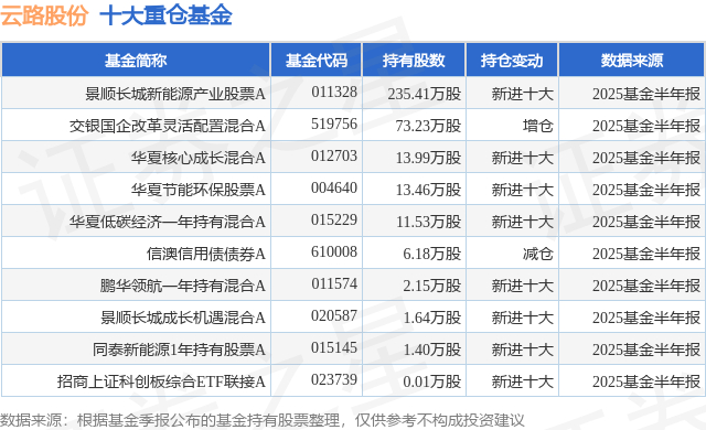 根据2025基金半年报公募基金重仓股数据,重仓该股的公募基金共10家,其中持有数量最多的公募基金为景顺长城基金的景顺长城新能源产业股票A。景顺长城新能源产业股票A目前规模为23.7亿元,最新净值1.4457(10月14日),较上一交易日下跌1.75%,近一年上涨38.96%。该公募基金现任基金经理为杨锐文 曾英捷。杨锐文在任的基金产品包括:景顺长城优选混合,管理时间为2014年10月25日至今,期间收益率为336.58%;景顺长城环保优势股票,管理时间为2016年3月15日至今,期间收益率为311.3%;景顺长城创新成长混合,管理时间为2019年10月17日至今,期间收益率为105.02%;景顺长城成长领航混合,管理时间为2020年5月28日至今,期间收益率为71.51%。