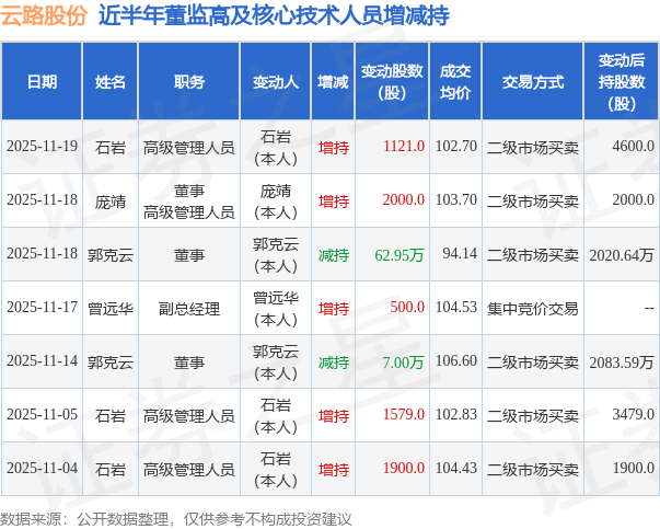 云路股份近半年内的董监高及核心技术人员增减持详情如下: