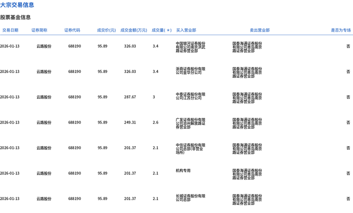 1月13日,云路股份大宗交易成交18.7万股,成交额1793.15万元,占当日总成交额的10.53%,成交价95.89元,较市场收盘价105.66元折价9.25%。