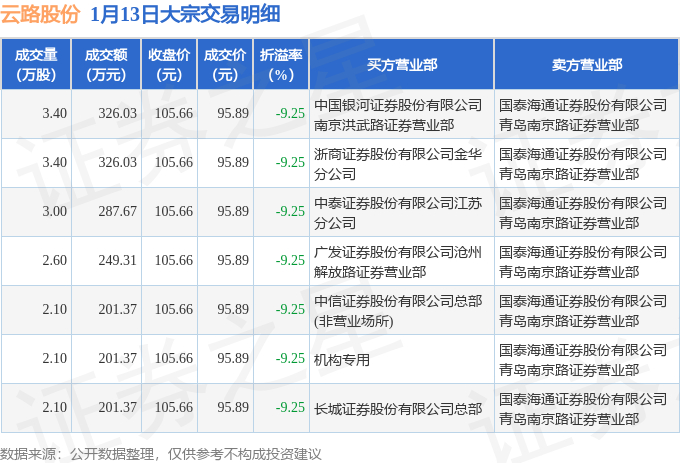 1月13日云路股份现7笔大宗交易 机构净买入201.37万元