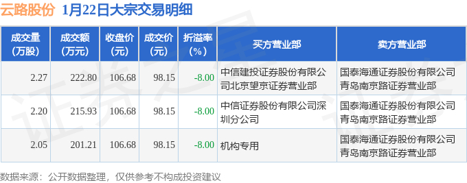 1月22日云路股份现3笔大宗交易 机构净买入201.21万元