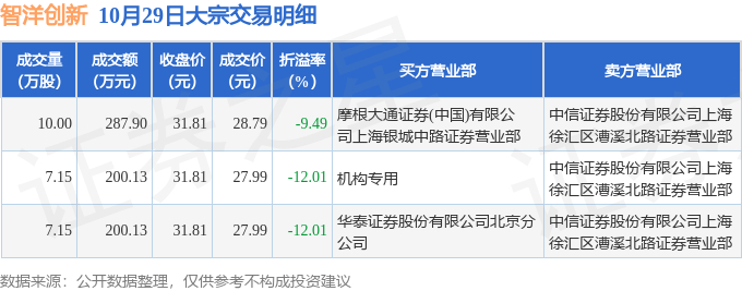10月29日智洋创新现2笔折价12.01%的大宗交易 合计成交688.16万元