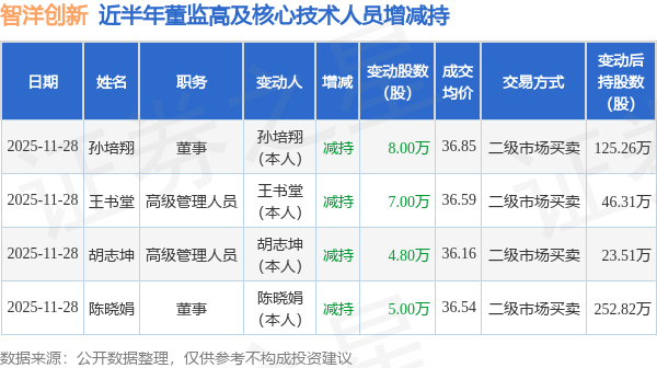 智洋创新近半年内的董监高及核心技术人员增减持详情如下: