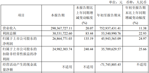 2025年前三季度,智洋创新营业收入为7.53亿元,同比增长11.38%;归属于上市公司股东的净利润0.46亿元,同比增长24.97%;归属于上市公司股东的扣除非经常性损益的净利润0.36亿元,同比增长25.66%;经营活动产生的现金流量净额-0.72亿元。