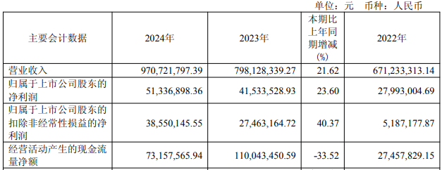 2024年,智洋创新营业收入为9.71亿元,同比增长21.62%;归属于上市公司股东的净利润0.51亿元,同比增长23.60%;归属于上市公司股东的扣除非经常性损益的净利润0.39亿元,同比增长40.37%;经营活动产生的现金流量净额0.73亿元,同比下降33.52%。