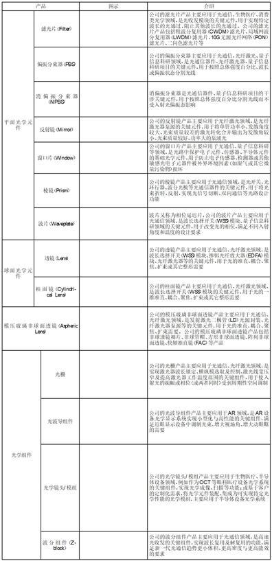 公司产品主要包括精密光学元组件、光纤器件两大类,具体如下: