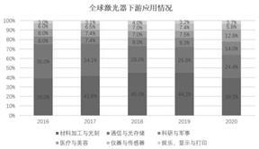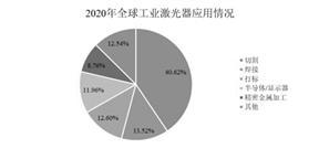 在激光器六大类下游行业应用中,“材料加工与光刻类”以及“通信和光储存类”的激光加工设备尤为明显。其中,材料加工与光刻类的激光加工设备,因其相较于传统材料加工与材料刻蚀具有更高效、环保,且具有低能量耗用以及无噪声污染的优势,替代效应明显。根据Laser Focus World数据,在全球激光器销售总额持续增长的大环境下,激光设备用于材料加工与光刻的总额占全球激光器下游应用的占比最高,一直占据40%左右的份额,而应用于材料加工方面的激光器主要是工业激光器。