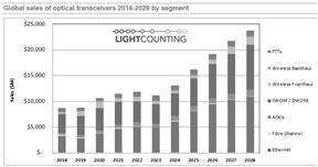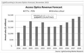 接入网方面,由于RAN(无线接入网络)和FTTx部署的正常周期性之外的库存过剩,2023年光接入网市场有所下降。随着中国市场结束10G PON部署周期,而北美和欧洲在政府资助项目的推动下逐步增加10G PON部署,FTTx网络的PON销售将保持稳定。25G和50G PON未来有望提供新的增长动能。无线前端(Wireless Fronthaul)增速较慢,因为中国的5G网络部署已接近完成。但随着未来6G部署的开始,该细分市场将在2026-2027年恢复增长。LightCounting预计,到2028年,接入网市场的年复合增长率(CAGR)将达到9%。