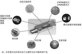 公司的精密光学元组件、光纤器件产品,处于光通信产业链的上游,精密光学元组件是制造光纤器件的基础,光模块又由光学元组件、光纤器件封装而成。例如,光收发模块(光模块的一种,如下图所示)中,其主要构成包括滤光片、偏振分束器(PBS)、消偏振分束器(NPBS)、棱镜、透镜、非球面透镜等各类光学元件,以及环行器、准直器、合波分波组件、光复用器等光纤器件。光电子元器件的指标水平和可靠性决定了光模块、光设备的光学性能和可靠性,因此光学元组件、光纤器件构成了光通信产业的基础性支撑。