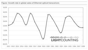 以太网光模块市场集中,下游大型云计算厂商采购计划的调整,是造成波动的主要原因,对经济衰退的担忧也会影响着ICP和CSP的资本开支。根据LightCounting在2023年9月的预测,2023年以太网光模块的全球销售额将下降5%,但由于人工智能集群对400G和800G光连接的需求非常强劲,光器件对于数据中心和全球其他网络基础设施至关重要,LightCounting大幅提高了对未来2~3年400G/800G光模块销量的预测,从而将2024年一2025年的市场年增长率提高到30%左右。
