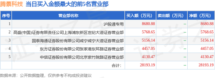 9月11日腾景科技(688195)龙虎榜数据:游资咸宁咸宁大道上榜