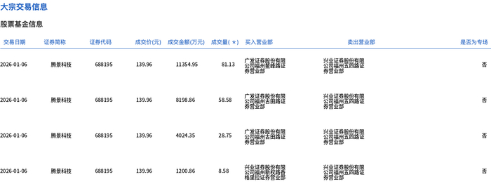 1月6日,腾景科技大宗交易成交177.04万股,成交额2.48亿元,占当日总成交额的14.57%,成交价139.96元,较市场收盘价168.99元折价17.18%。