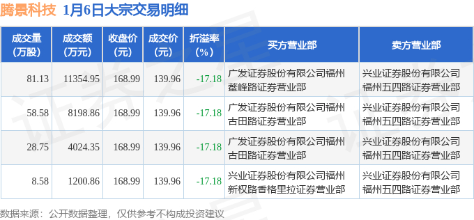 1月6日腾景科技现4笔折价17.18%的大宗交易 合计成交2.48亿元