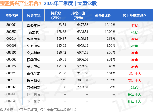 根据2025基金半年报公募基金重仓股数据,重仓该股的公募基金共8家,其中持有数量最多的公募基金为宝盈基金的宝盈新兴产业混合A。宝盈新兴产业混合A目前规模为5.78亿元,最新净值1.1235(9月26日),较上一交易日下跌0.92%,近一年上涨56.54%。该公募基金现任基金经理为王灏。王灏在任的基金产品包括:宝盈发展新动能股票A,管理时间为2023年4月15日至今,期间收益率为24.26%;宝盈优质成长混合A,管理时间为2025年5月17日至今,期间收益率为20.2%;宝盈融源可转债债券A,管理时间为2025年8月2日至今,期间收益率为8.66%。