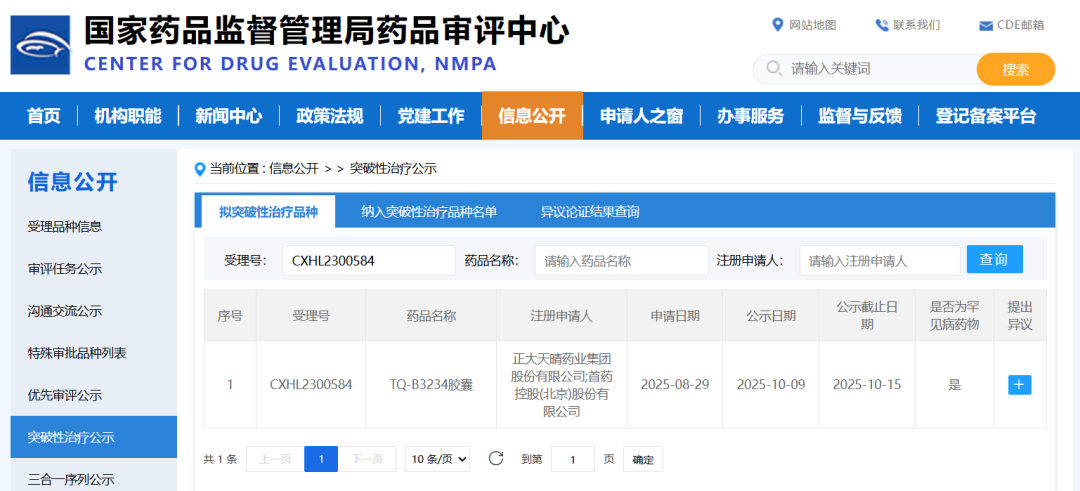 正大天晴/首药控股1类创新药拟纳入突破性治疗品种