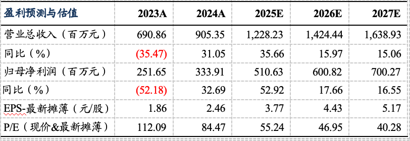 考虑到封测行业景气度+公司新品节奏,我们上调公司2025-2027年归母净利润为5.1(原值4.6)/6.0(原值5.4)/7.0(原值6.0)亿元,当前市值对应动态PE分别为55/47/40X,维持“增持”评级。