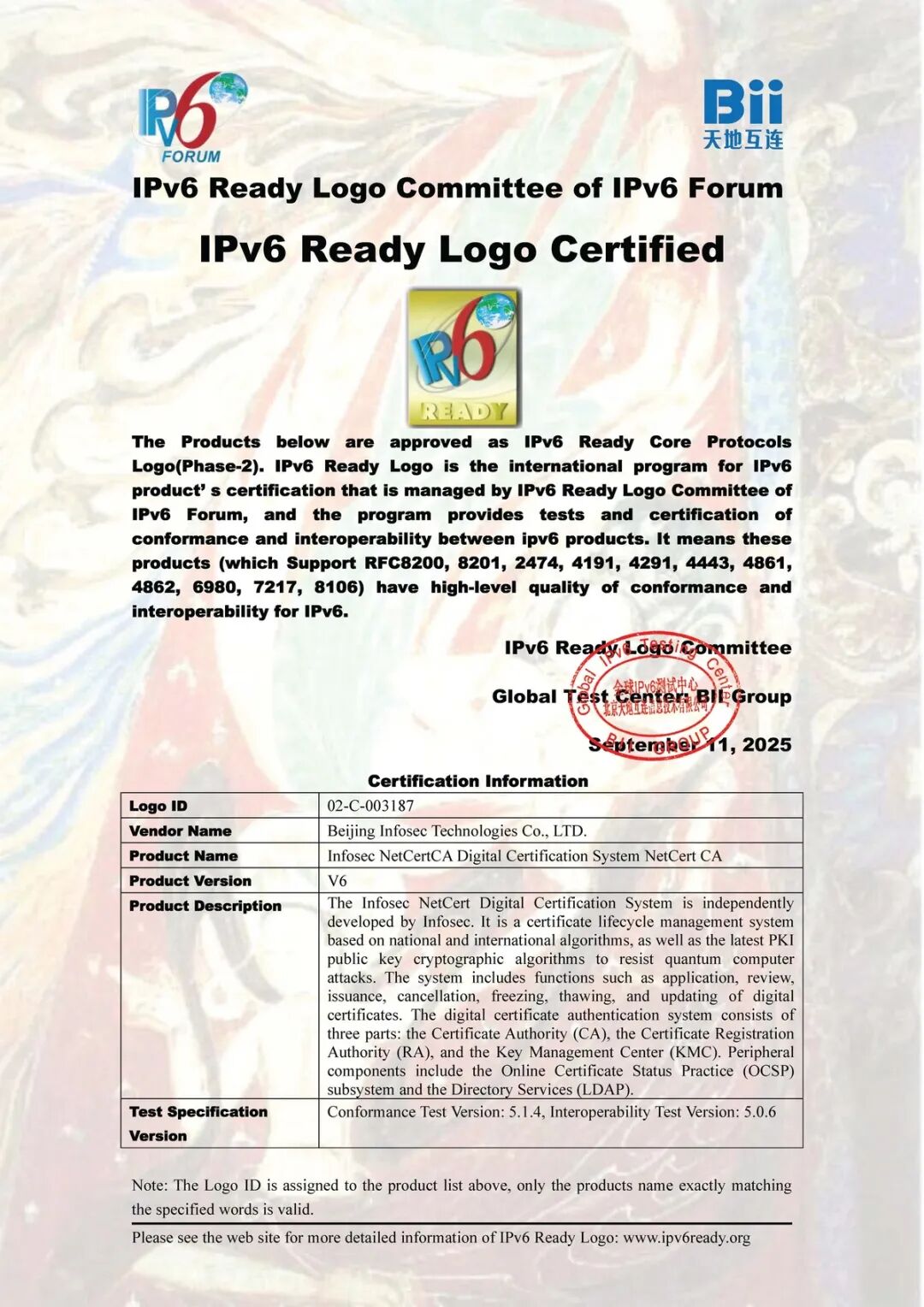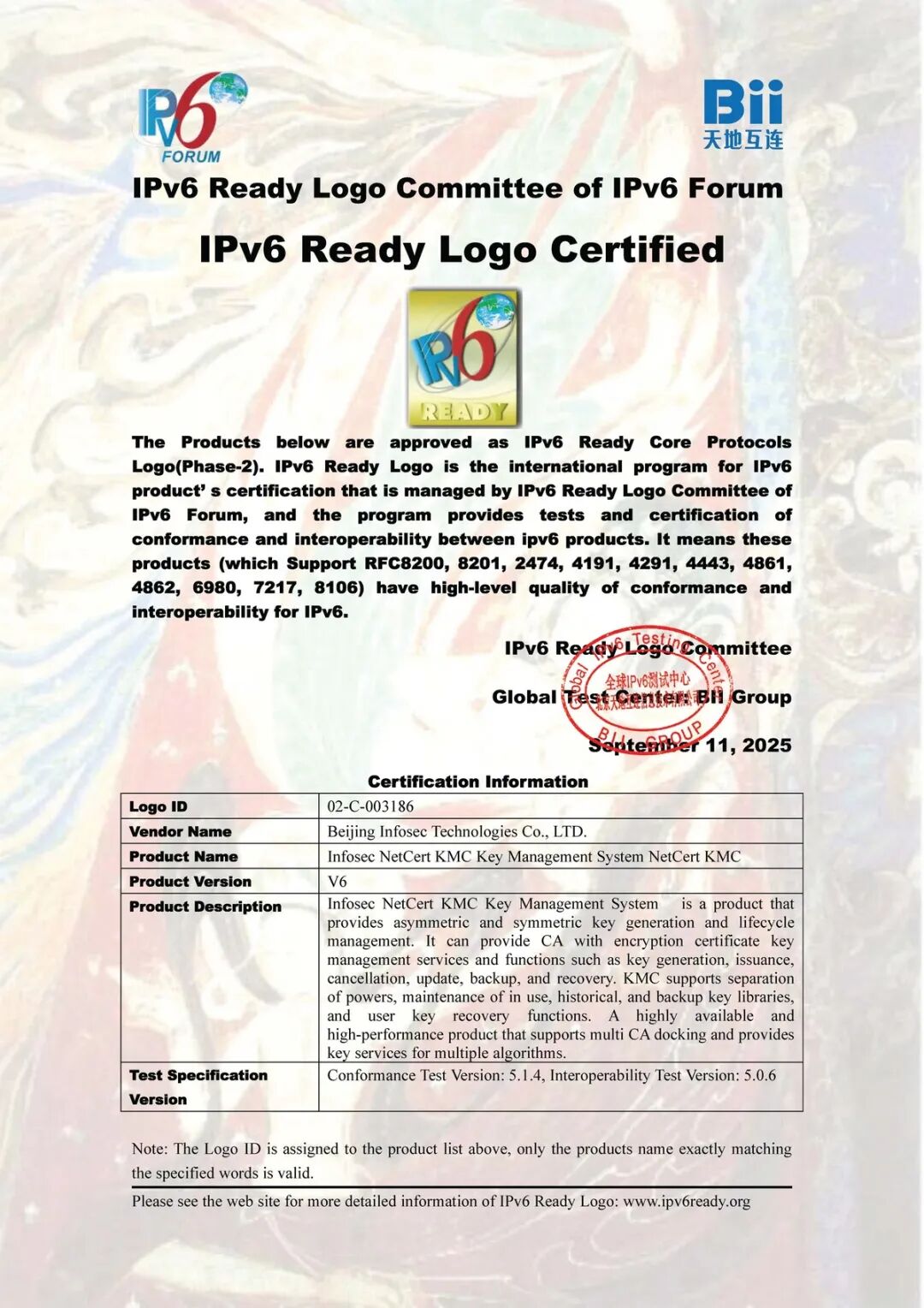 近日,北京信安世纪科技股份有限公司(以下简称“信安世纪”,股票代码:688201)旗下多款核心产品——信安可信时间戳服务器NetTSA、信安协同签名系统MAuth-10000C-DA、信安零信任统一身份认证管理系统NetAuth、信安密钥管理系统NetCert KMC、信安数字证书认证系统NetCert CA及信安密码安全服务管理平台CSSP,正式通过下一代互联网国家工程中心-全球IPv6测试中心IPv6 Ready核心协议Phase-2测试,并荣获由国际组织IPv6 Forum颁发的IPv6 Ready Logo Phase-2认证证书。