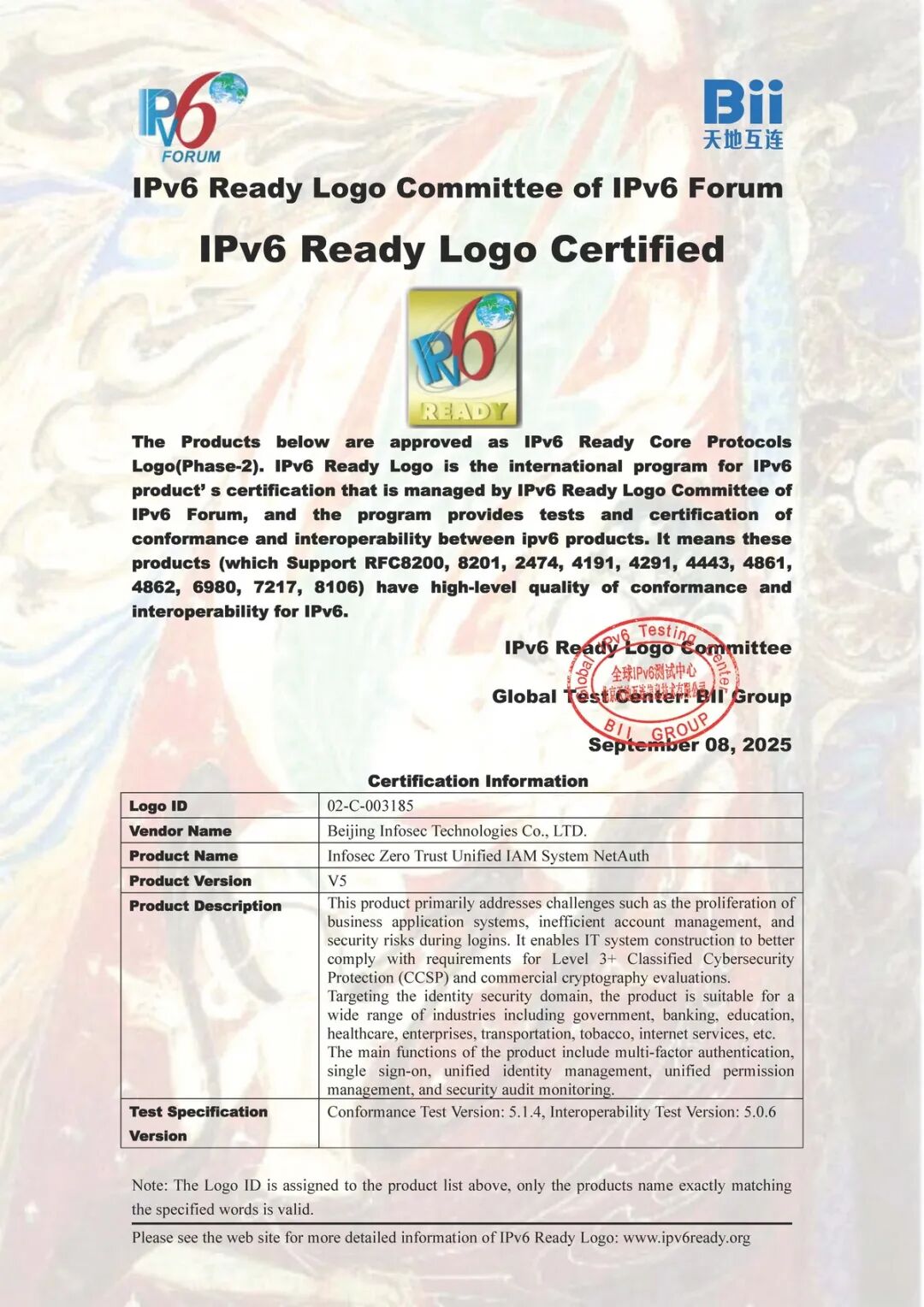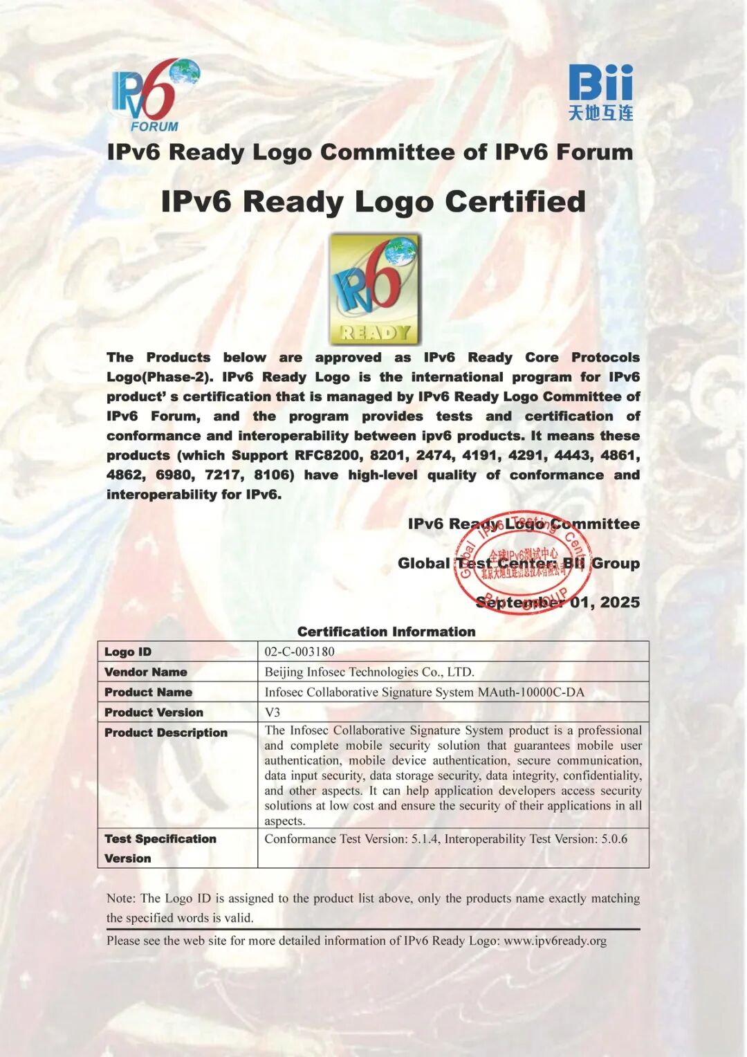 信安世纪多款产品荣获IPv6 Ready Logo Phase-2认证