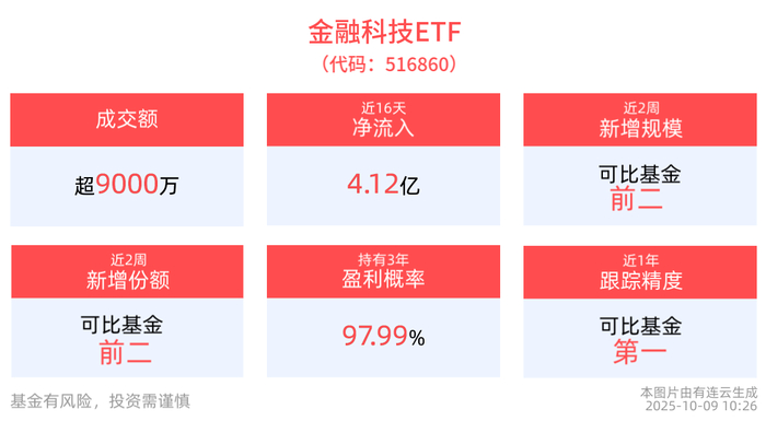 份额方面,金融科技ETF近2周份额增长400.00万份,实现显著增长,新增份额位居可比基金2/6。