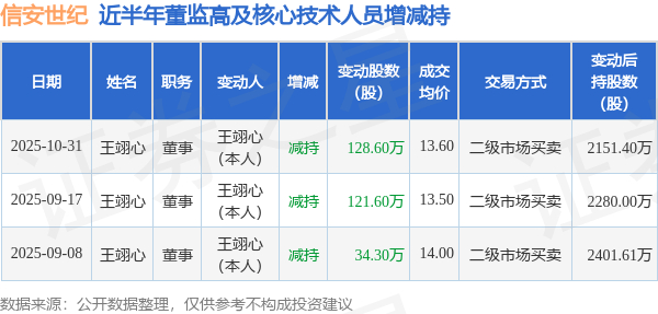 信安世纪:10月31日高管王翊心减持股份合计128.6万股