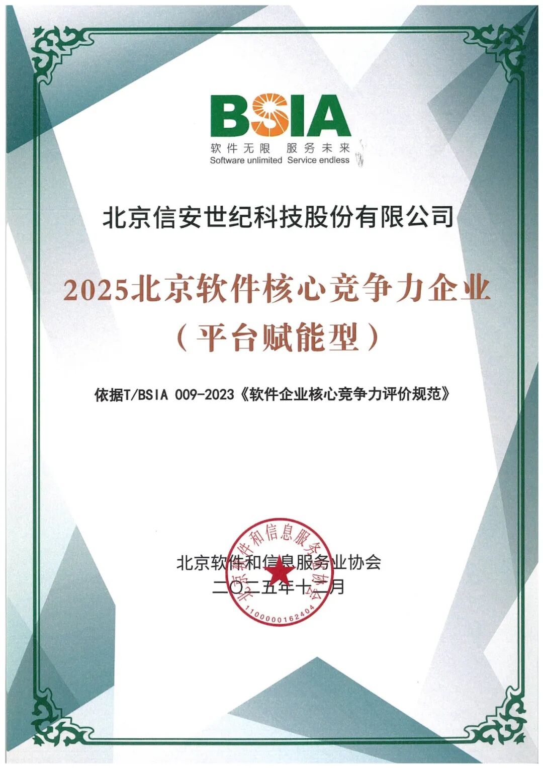 授予 “2025北京软件企业核心竞争力企业(平台赋能型)”