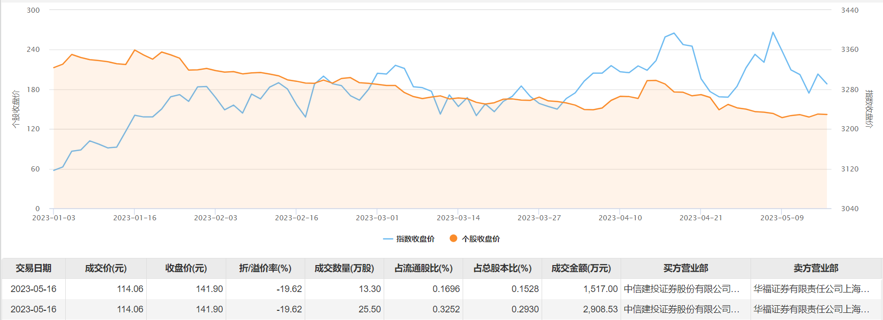 5月16日大宗交易成交38.8万股,成交额4425.53万元,占当日总成交额的23.09%,成交价114.06元,较市场收盘价141.9元折价19.62%。