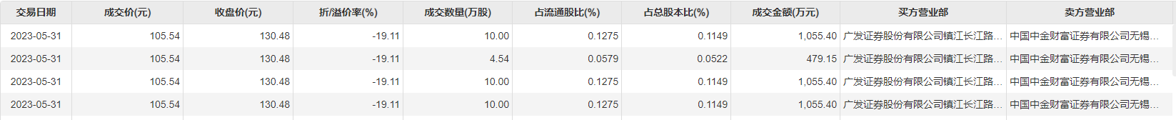 5月31日大宗交易成交34.54万股,成交额3645.35万元,占当日总成交额的13.2%,成交价105.54元,较市场收盘价130.48元折价19.11%。
